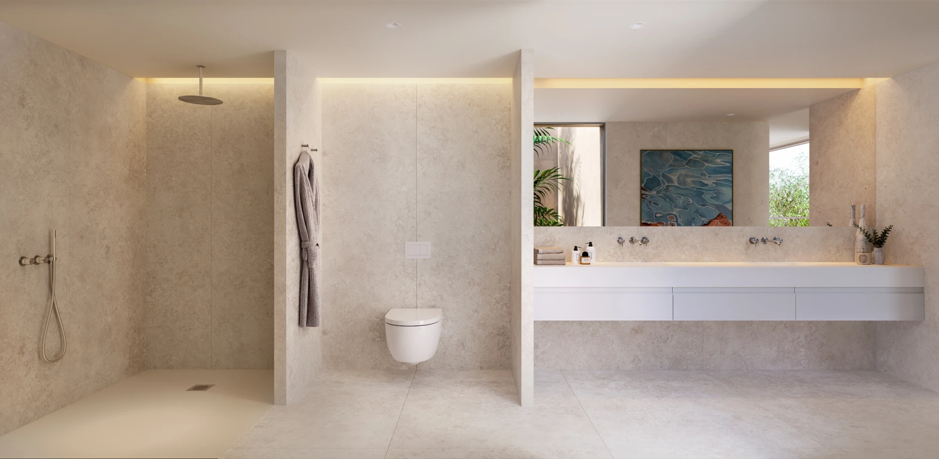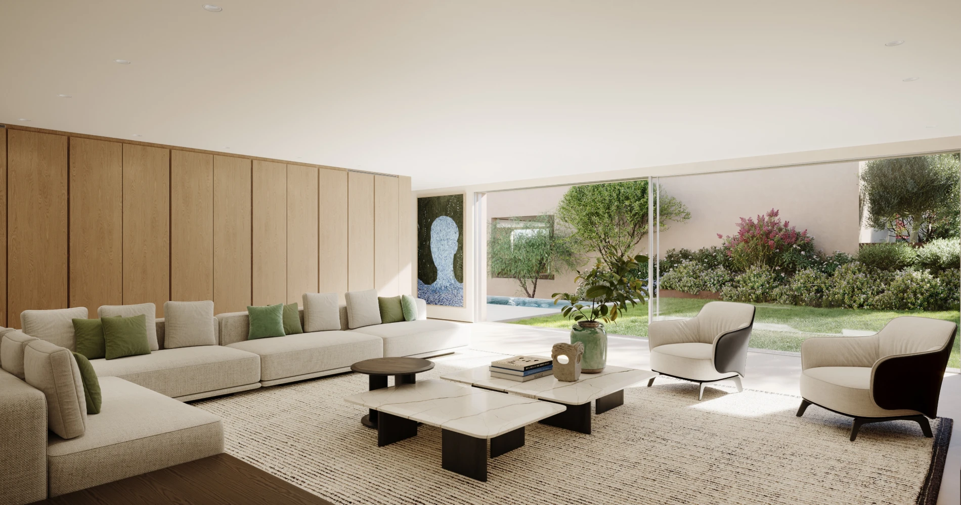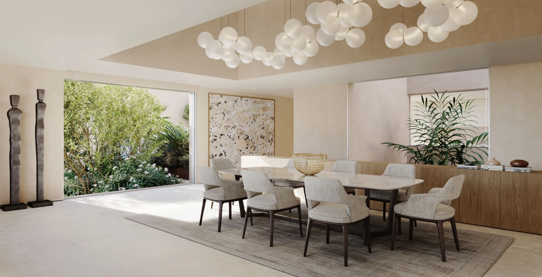It offers large, inviting living rooms bathed in the colors of the garden, spacious kitchens opening onto open-air interior gardens, with luxuriously equipped bathrooms, large and profusely lit with natural light reflected off the white marble.