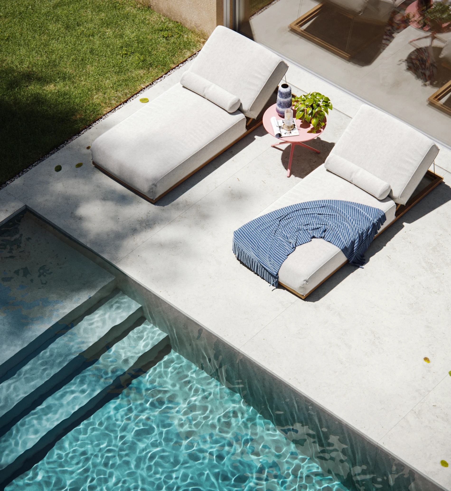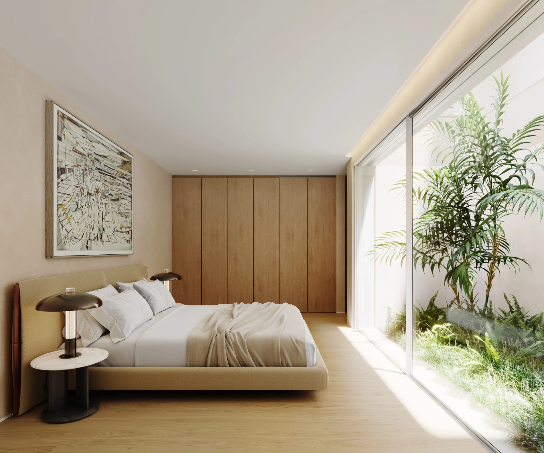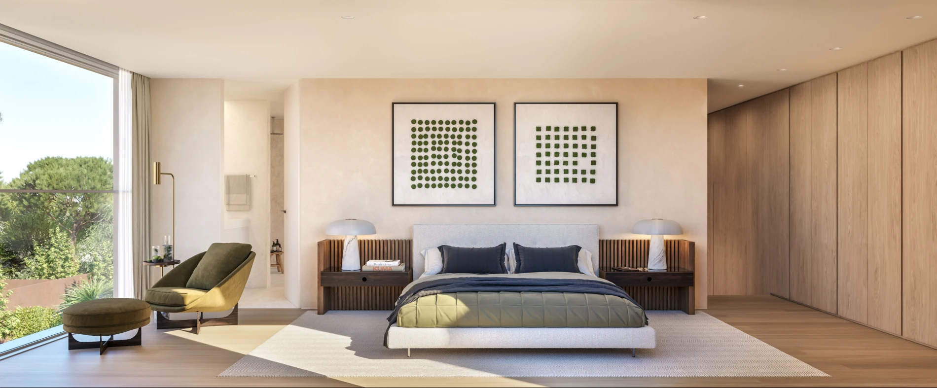 It offers large, inviting living rooms bathed in the colors of the garden, spacious kitchens opening onto open-air interior gardens, with luxuriously equipped bathrooms, large and profusely lit with natural light reflected off the white marble.