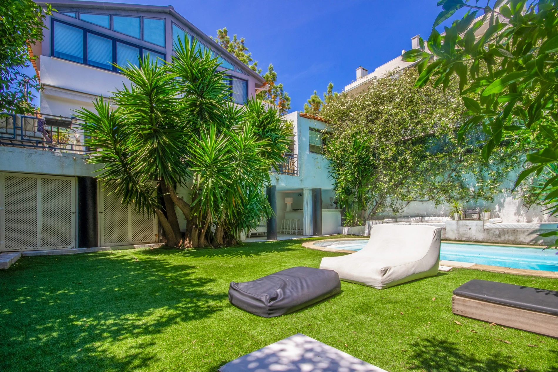 The outdoor area offers a garden, swimming pool, a lounge/bar support area, and a storage room.
