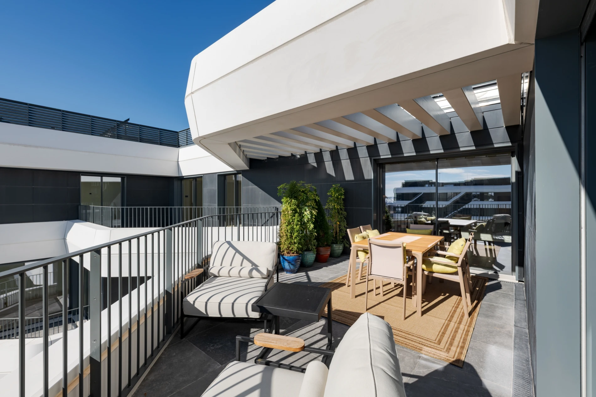 A sensação de amplitude é constante, e estende-se a uma zona verde elevada, com piscinas e espaços ajardinados.