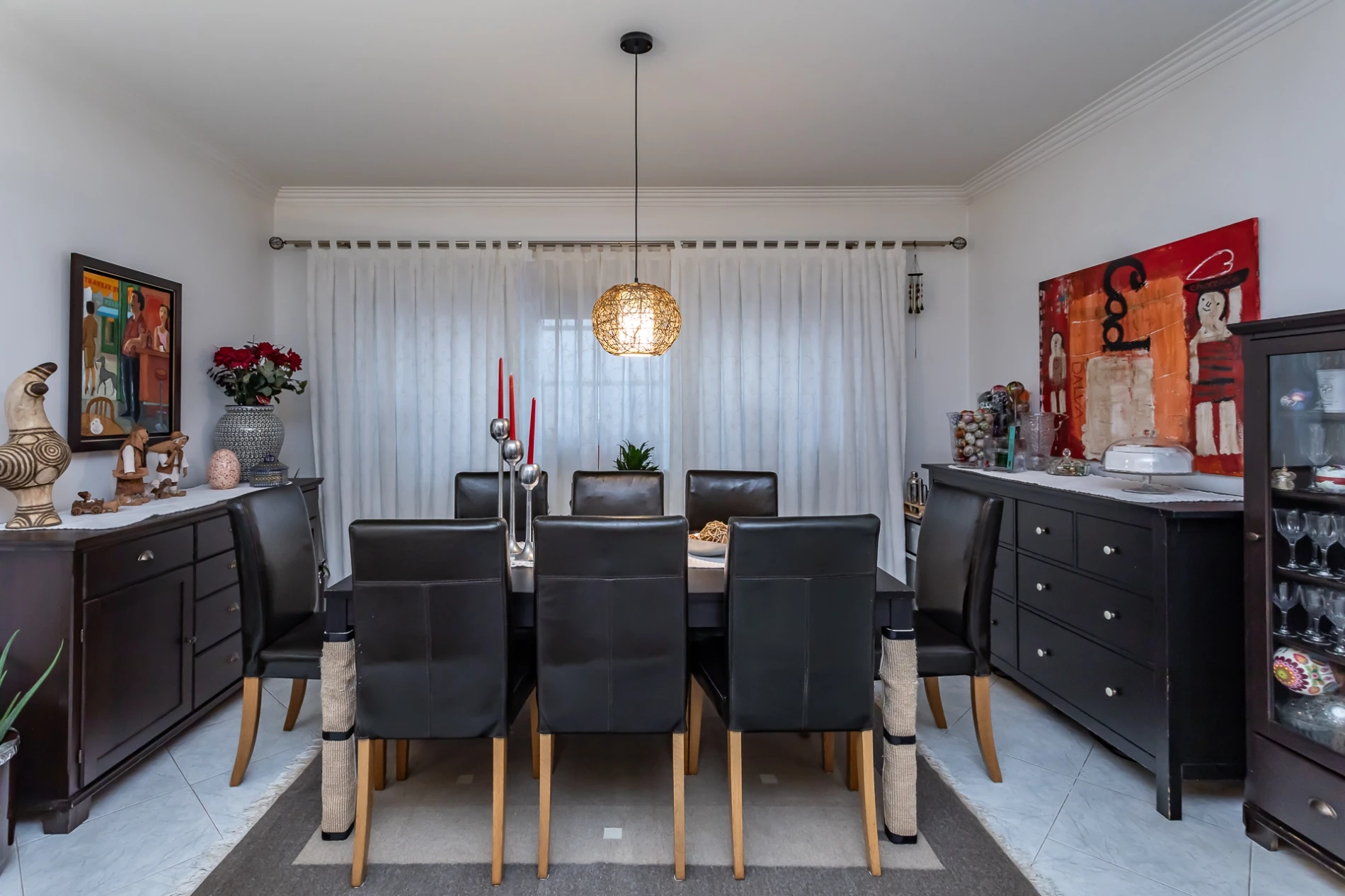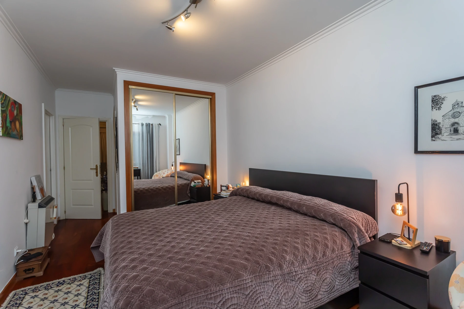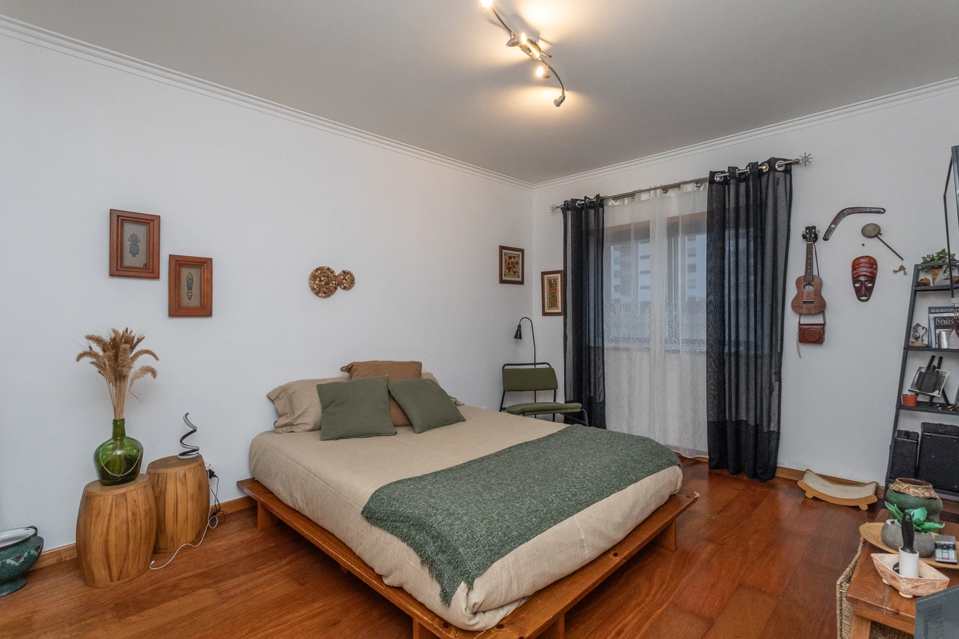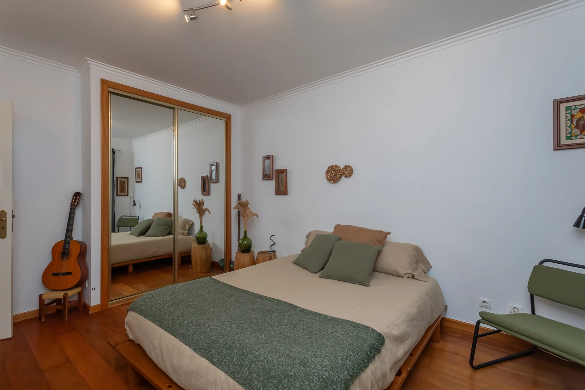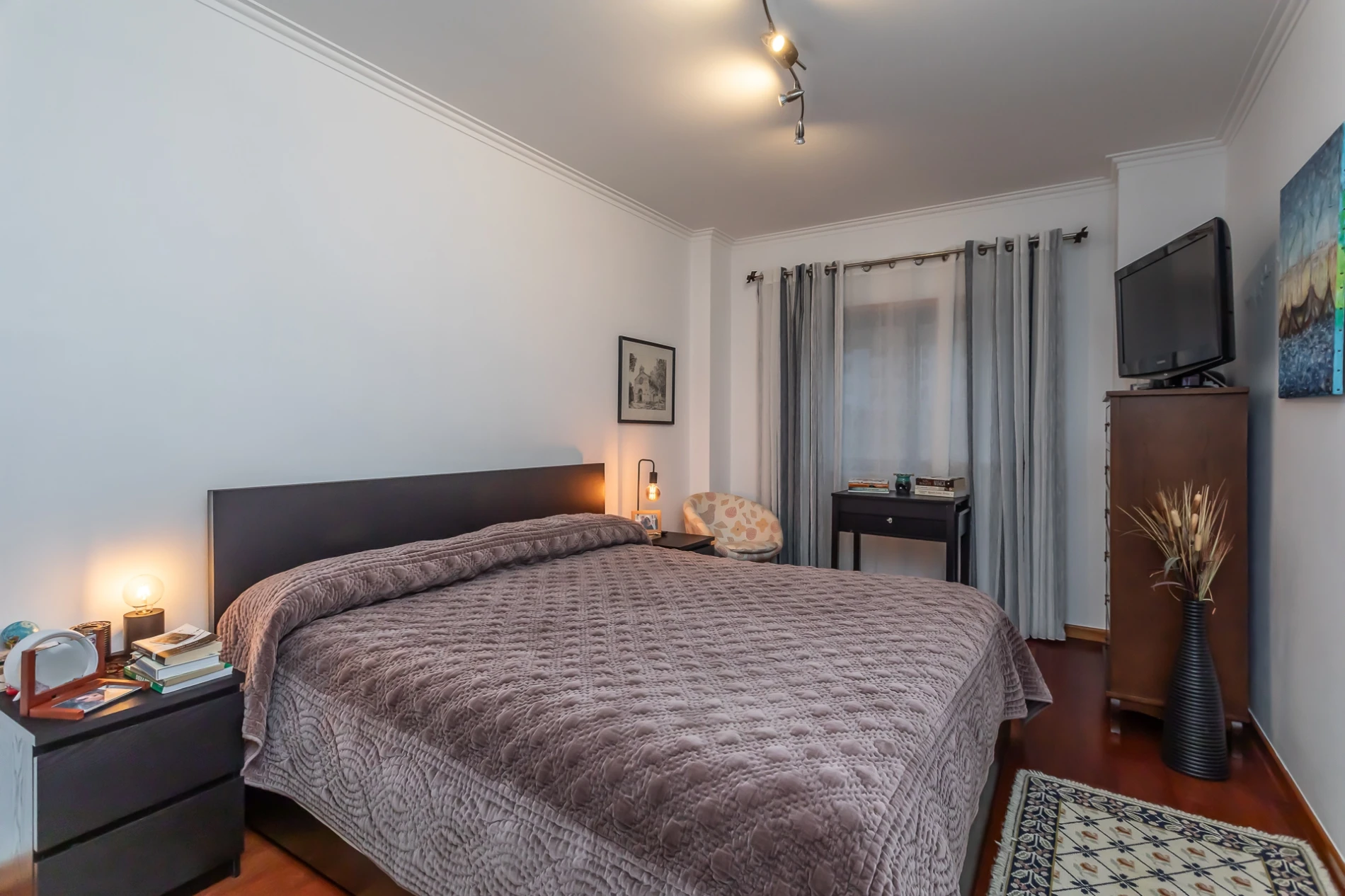 Na zona privada, dispõe de quatro quartos espaçosos, dois com roupeiros embutidos, todos com janelas amplas e vidro duplo, proporcionando conforto térmico e acústico. Destaca-se a suíte principal com casa de banho privativa e closet.